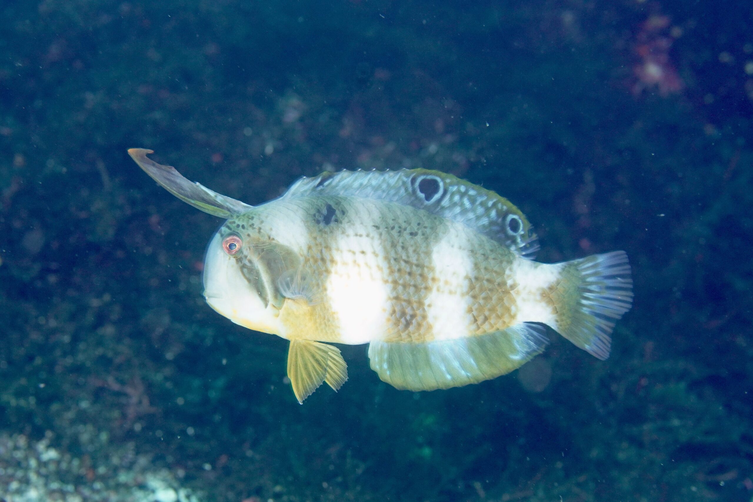 第一背びれの前縁と尾びれ上部の縁にある黒色斑が特徴です。