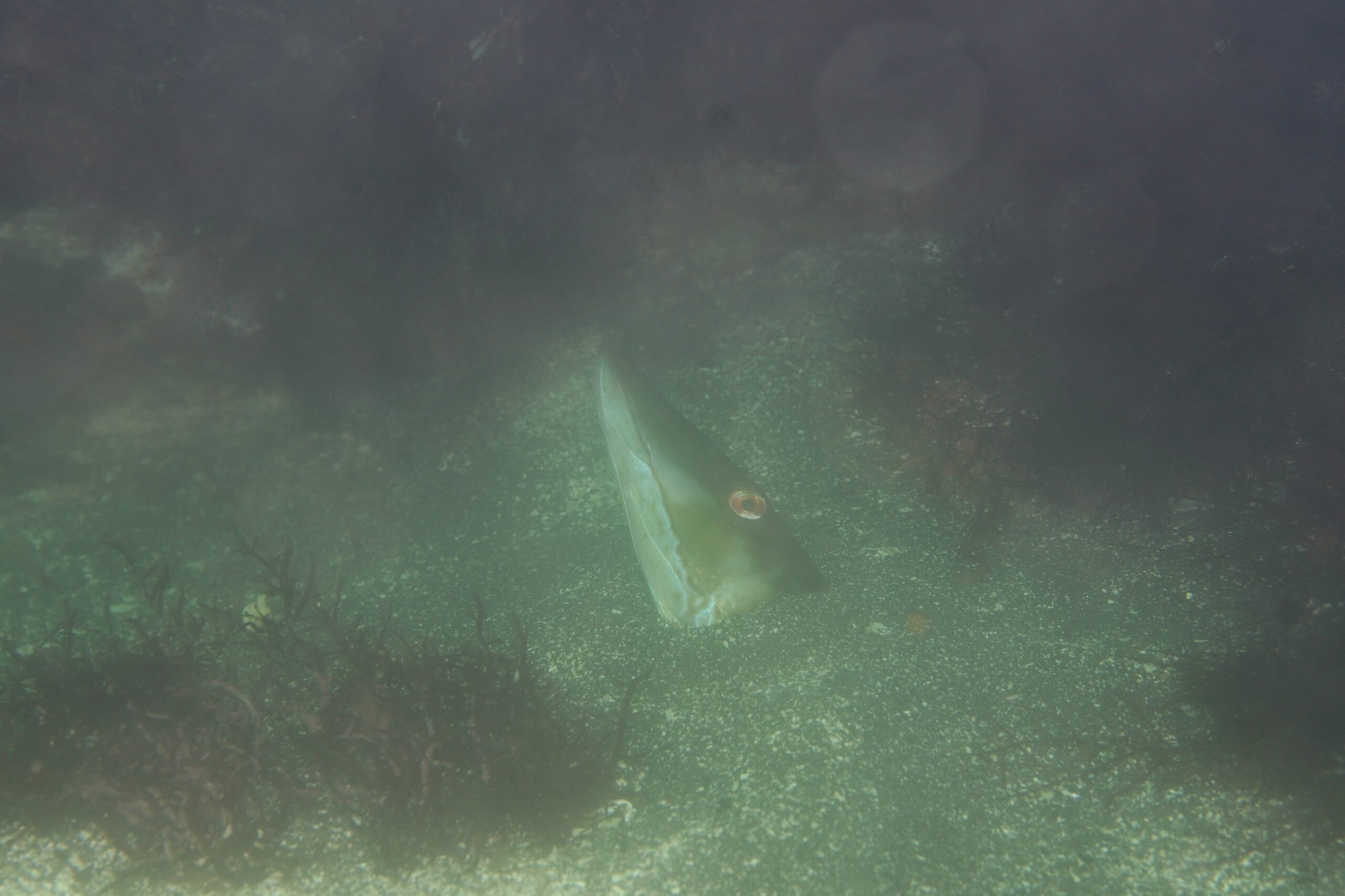 ルートの確認どころか自分がどっちに泳いでいるのかもよくわからないので、とりあえずテトラ沿いに水深を落として探索しつつ、満足したら陸の方角に帰ってくることにします。