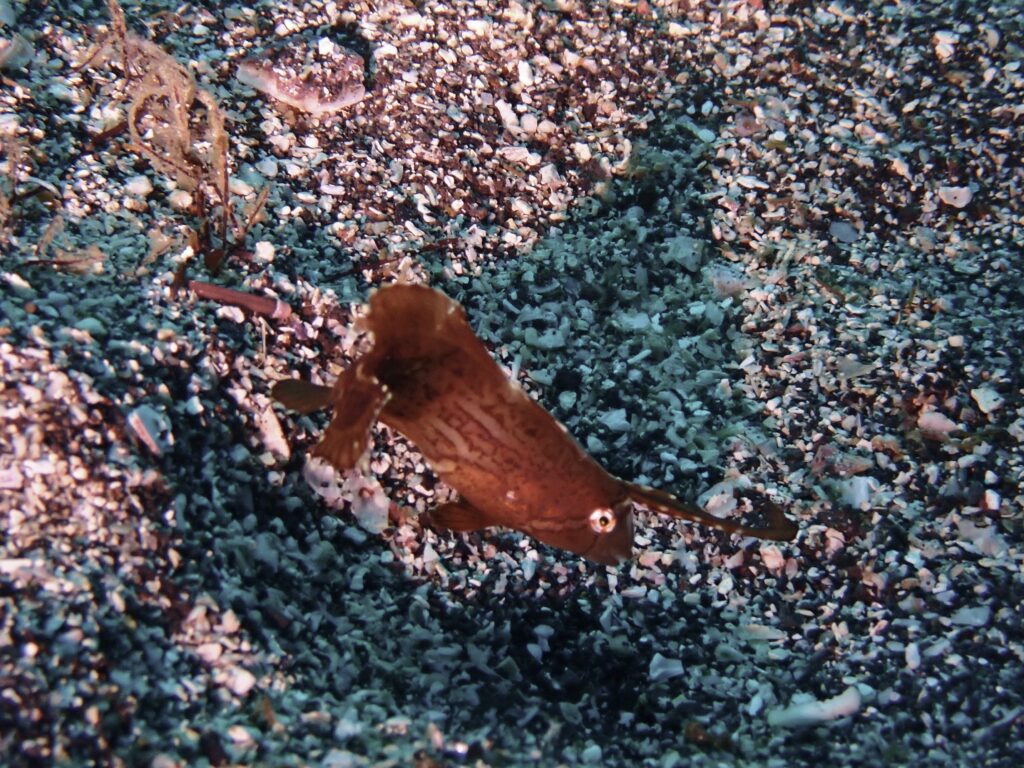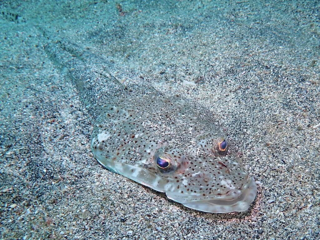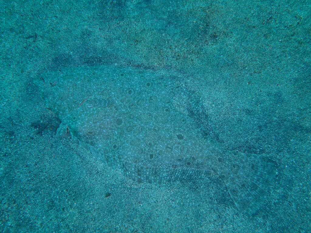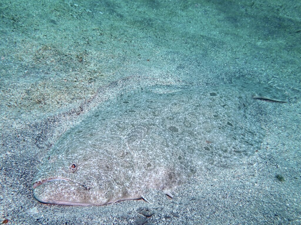 砂地でアキアナゴのコロニーを観察した後、ヒラメに遭遇。