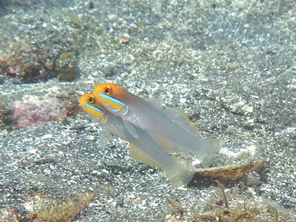 このペアから少し離れた場所にアカハチハゼが1匹でぽつんと佇んでおり、少し切ない気持ちになりました…