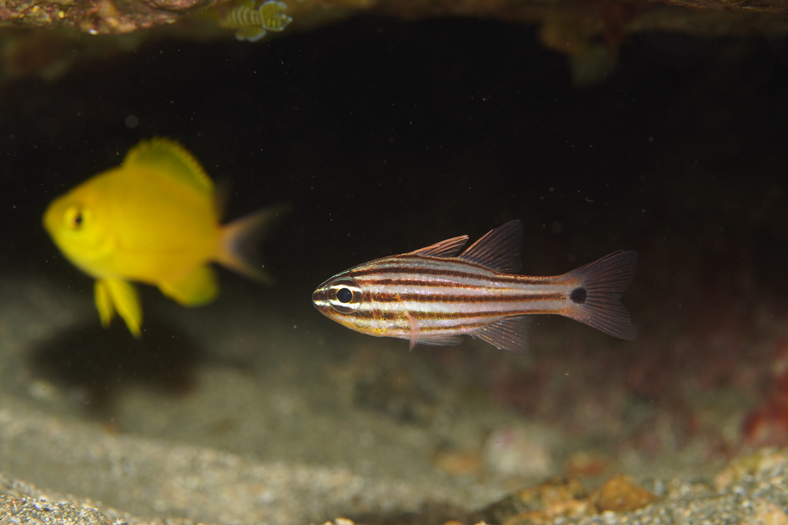 尾びれの付け根にある黒斑と、体側に走る7本の縦線が特徴です。