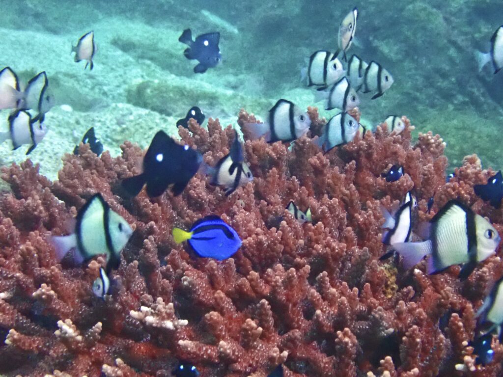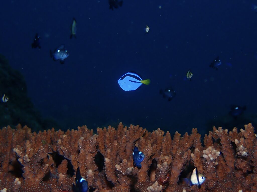 フタスジリュウキュウスズメダイやミツボシクロスズメダイの幼魚と一緒にサンゴに住み着いていました。