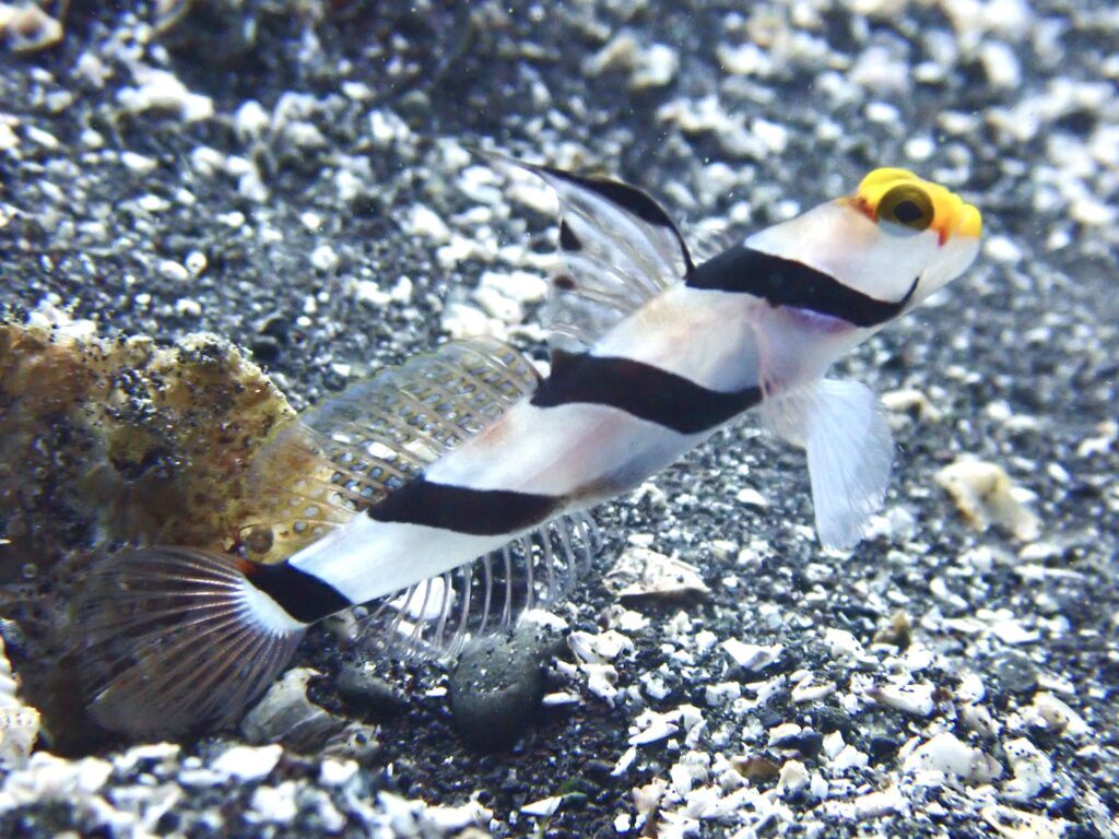 ここではネジリンボウ1匹とコトブキテッポウハゼ2匹が同じ巣穴に住んでいます。