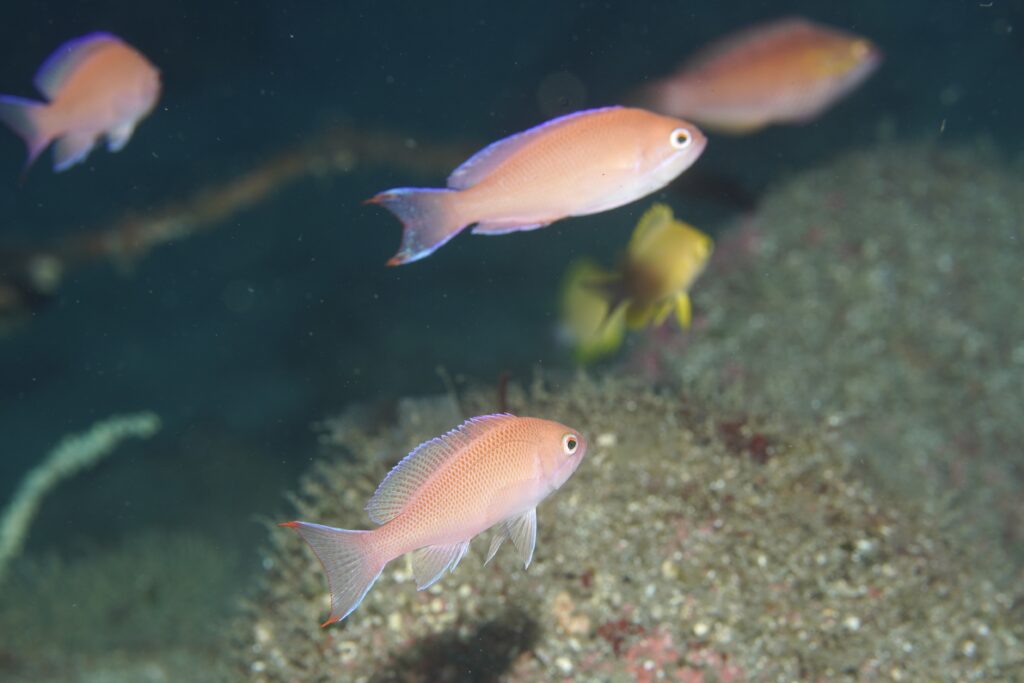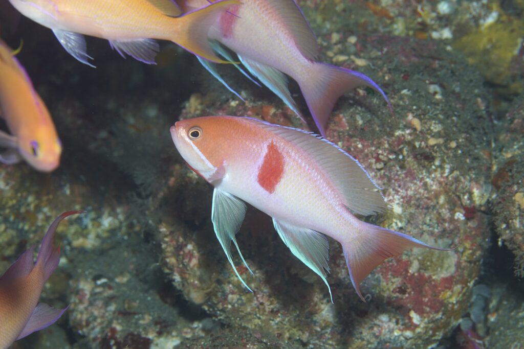 基本的に群れでいるので、オスの近くにアカオビがないハナダイがたくさんいたらそれがメスです。