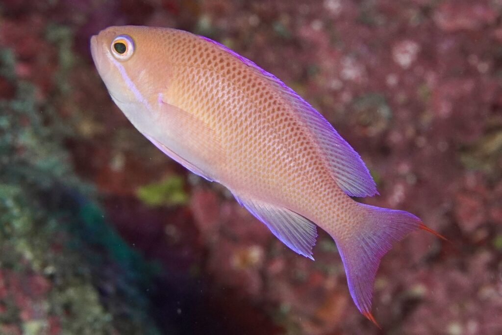 見慣れてしまってはいますが、メスもピンクの体色に紫がかったひれ、尾びれの両先端に入る小さな赤が可愛いんですよね。